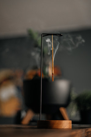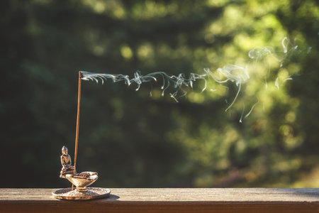 Warm sunlight bathes a rustic wooden table as delicate tendrils of incense waft upward, infusing the space with serenity and inviting relaxation.