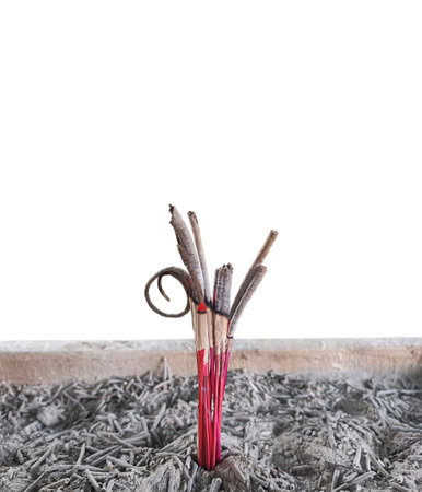 Incense in a ash pot and have space for write wording, important material in religion activity, use in temple especially in important festival, danger from dust, smoke and ash affect respiratory organ