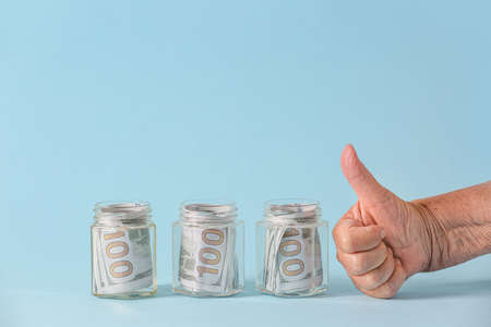 Hand of senior woman showing thumb-up gesture near jars with money on color background. Concept of pension