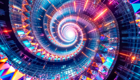 An abstract composition features a swirling spiral composed of countless colored particles. The artwork displays a variety of colors, creating a vibrant and dynamic visual experience. The design suggests a sense of depth and movement, potentially suitable for digital art, visual effects, and graphic design applications. The image can be used for a wide range of creative and commercial projects.