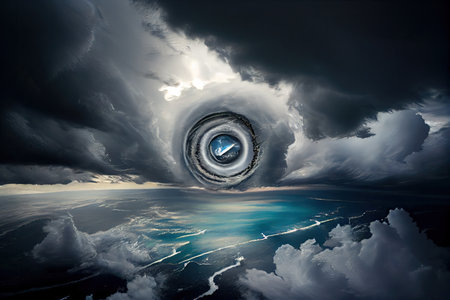 Dramatic aerial view of a powerful hurricane with eye over the ocean
