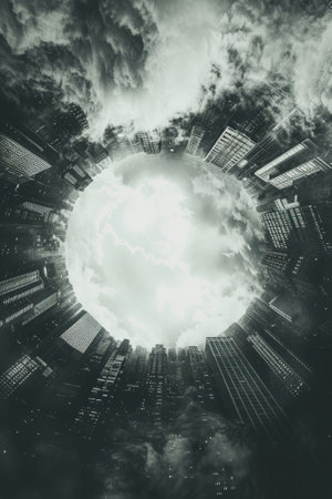 A dark, atmospheric scene depicts swirling storm clouds enveloping a city. The composition features a central vortex with a glowing core, contrasting against the dark, textured clouds. The overall lighting suggests a dramatic, possibly apocalyptic setting. Suitable for various editorial and commercial projects.