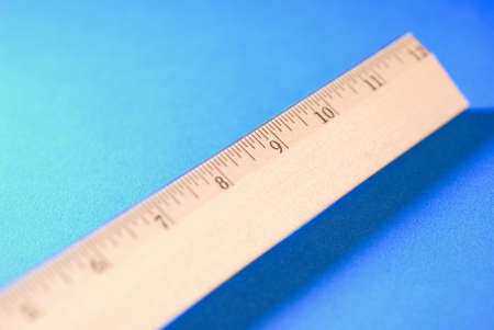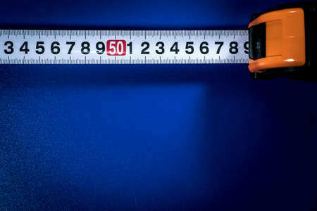 A metal ruler with a scale on a blue background is a superscape with a copy of the space for your text. Isolate