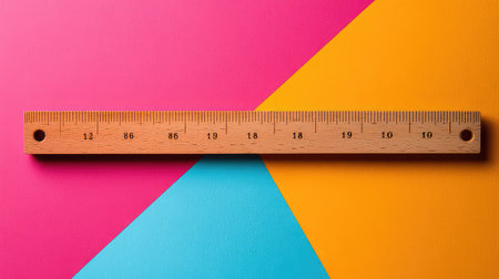 This image features a wooden ruler placed over a vibrant geometric background of pink, blue, and orange sections, perfect for educational materials, crafting, or design inspiration.