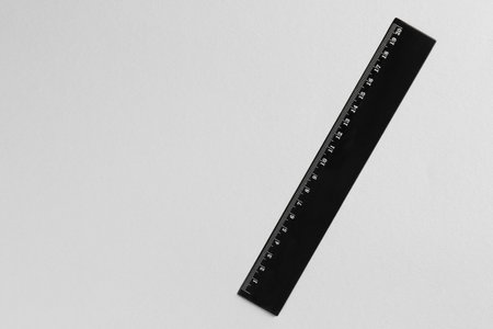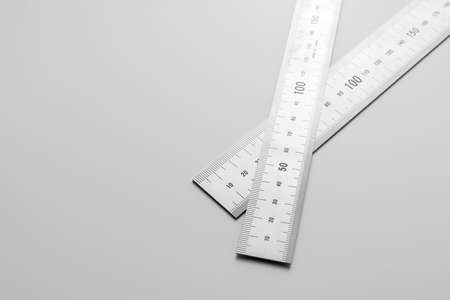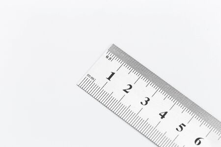 Iron ruler close-up on a white background. Stainless steel ruler. Working tools made of metal and stationery. Selective focus, isolated on white