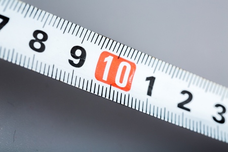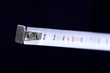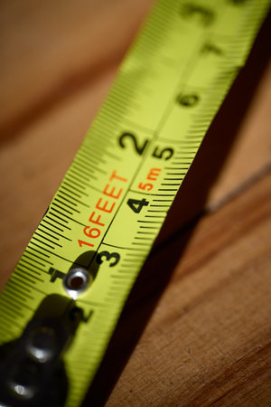 A closeup shot of a white and red tape measure on the table under the lights - designing concept
