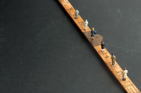Social distancing coronavirus queue of miniature people walking on a ruler on top of a chalkboard