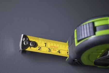 Tape measure on a yellow background. Top view. Minimalistic industrial concept