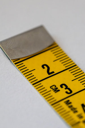 A close-up shot of a yellow fabric measuring tape with a metal end, showing the metric scale in centimeters. The tape displays numbers 2 and 3, highlighting its precision for various tasks.