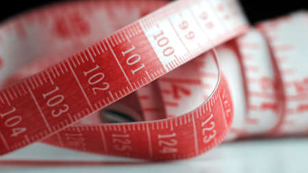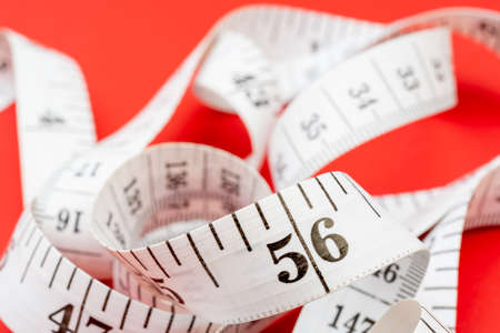 White measuring tape on red background. Measurement of length and circumference. Lose weight and get fat.