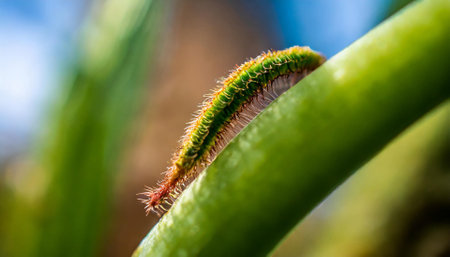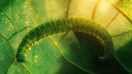 A visually striking close-up of a green caterpillar perched on a vibrant leaf, illuminated by sunlight. This image captures the intricate texture and natural beauty of the insect and its surroundings.