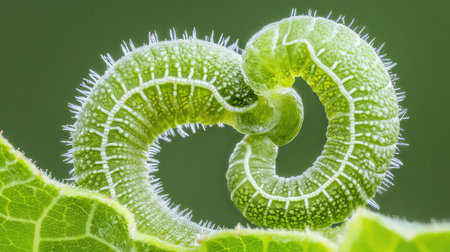 This macro photograph captures two intertwined caterpillars resting on a leaf, showcasing vibrant green colors and intricate textures.