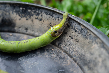 A Caterpillar mimics snake head crawling on a plastic tray. Their fake eyes or pretend horns, these snake-mimic caterpillars are able to ward off many a predator.