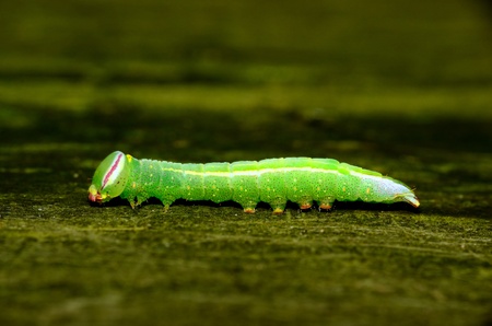A Green worm on wood plate
