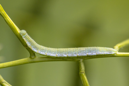 Caterpillar of Orange tip (Anthocharis cardamines) feeding on Garlic Mustard (Alliaria petiolata) plant with green background