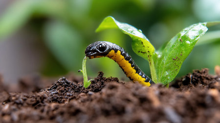 A vibrant green caterpillar is crawling on lush leaves, showcasing organic beauty and detail. The soft focus background highlights the delicate ecosystem.