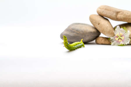 Green caterpillar isolated on white background. Butterfly worm close-up
