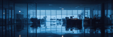 A spacious office interior features sleek furniture and large windows reflecting blue light. The atmosphere creates a calm, professional environment at dusk.