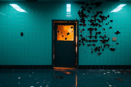 An abandoned room with turquoise tiled wall, featuring door with broken glass and fire damage. atmosphere is eerie and haunting, evoking sense of neglect and decay