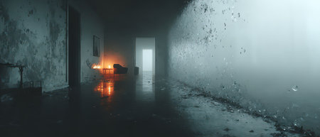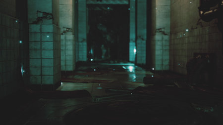 An abandoned corridor reveals dim light reflecting off wet tiles, casting haunting shadows. Dust particles float in the air, hinting at forgotten stories and secrets held within.