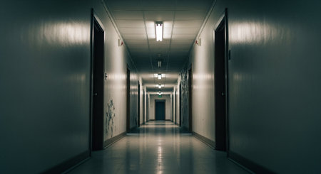A dimly lit corridor stretches ahead, lined with wooden doors and inviting an air of suspense and curiosity during night time.