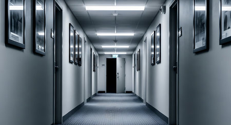 Minimalist corporate hallway with clean lines, bright lighting, and symmetry.