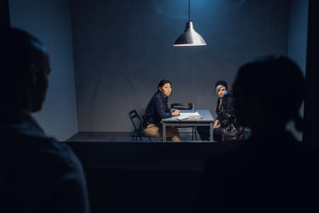 A detective and a witness watch through Gesell mirror as a young criminal drug dealer is interrogated.