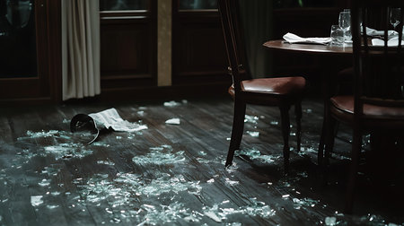 A dramatic scene unfolds in an upscale restaurant showcasing shattered glass and a tense atmosphere.