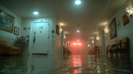 Dimly lit motel hallway with camera slowly zooming in on room 13's closed door.