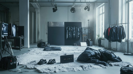 An artful fashion showroom featuring stylish clothing displays in an industrial setting. The scene showcases a modern aesthetic with a creative vibe, highlighting apparel, textures, and lighting elements.