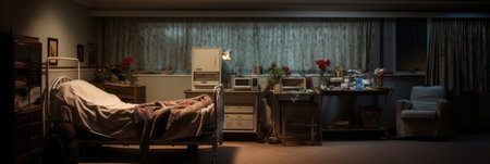 Hospital room with bed, monitor, and laptop on desk. Generative AI.