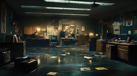 Broken ceiling tiles littering the floor of a dimly lit office filled with decaying desks and outdated tech