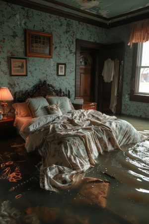 Flooded living room with water reflections damaged furniture interior disaster flooded concept
