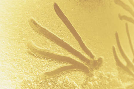 Sun with mountains tourism drawing drawn on a beach on the golden sand background, summer vacation at the resort