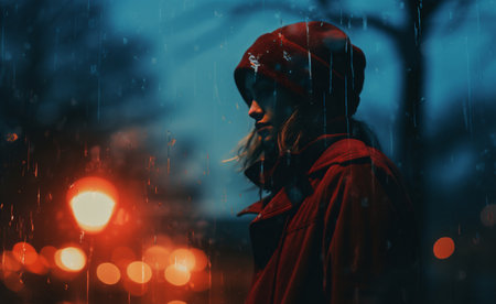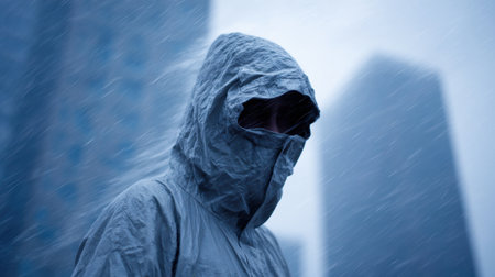 An urban individual stands alone in the rain wearing a hooded jacket. The blurred skyscrapers create a gloomy atmosphere, emphasizing solitude and reflection.