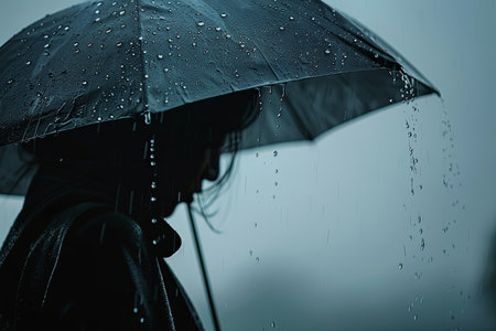 A lone figure stands in the rain, holding a black umbrella. Their head is down, and their shoulders are hunched, conveying a sense of melancholy and solitude.