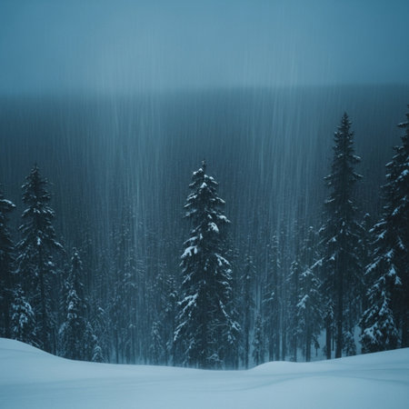 Individual in warm scarf and hat surrounded by falling snow in a chilly winter setting during nighttime