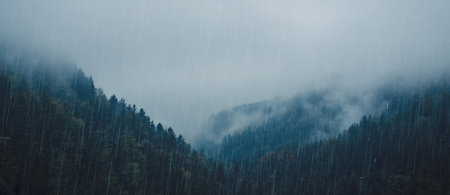 A powerful storm transforms a forest as trees bend under fierce winds, surrounded by a moody fog that envelops the landscape, evoking a sense of nature's raw beauty and power.