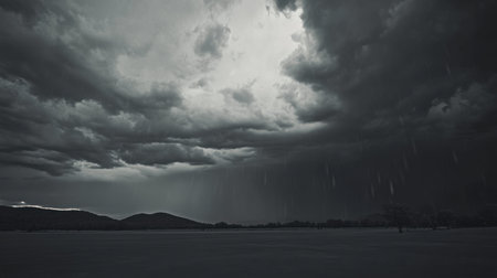 A vast ocean expanse is beneath an expansive, ominous sky filled with dark, textured clouds. Rain falls over the water, creating a moody, evocative atmosphere. The monochromatic color palette and overall composition suggest dramatic conditions suitable for editorial or commercial projects.