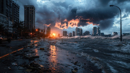 A dramatic sunset casts a fiery glow over a flooded city street. Waves crash against buildings as storm clouds loom, creating a stark contrast between nature and urban life.