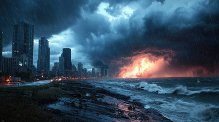 Dark clouds roll over a coastal city as a fierce storm brews. Bright flashes of lightning pierce the sky, reflecting off turbulent ocean waves, creating a striking contrast.
