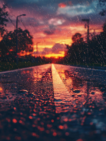 Vibrant rainy sunset street scene with reflective puddles and colorful city lights illuminating the wet road Dramatic atmospheric landscape with a moody serene and peaceful ambiance