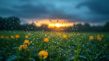Raindrops on yellow flowers in green field at sunset, blurred background with dramatic clouds. Nature and tranquility concept