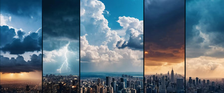 Captivating display of the sky shifting through various weather phenomena above a bustling city. Clouds gather, rain pours, lightning strikes, and sunlight breaks through.