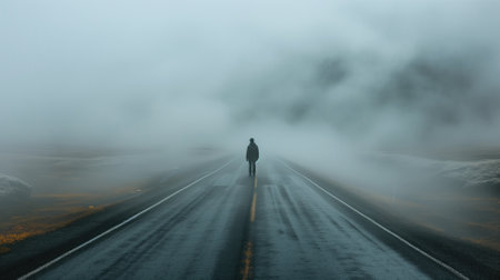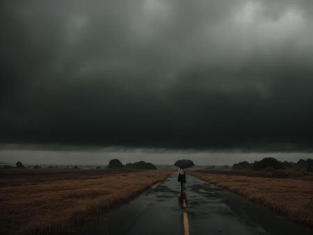 A dramatic scene of storm clouds approaching a long, deserted road, creating a striking contrast between the dark sky and the road, symbolizing isolation and the power of nature with impending rain. AI generated image