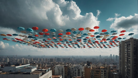The world where abstract architecture and nature concepts becomes reality and comes to life in a most unexpected ways. Umbrellas above city. Surreal environmental concept.