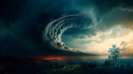 Huge cloudy windy storm. Stormy sky with dramatic clouds from an approaching thunderstorm. Generative AI illustration