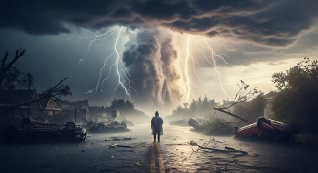 Dark and dramatic flooded street with a trapped car during a natural disaster, showing the devastating impact of climate change