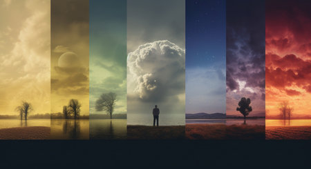 A collage of four weather scenes: lightning and thunder on the left side, a blue sky with white clouds in the center, the sun shining brightly on the right side, and a clear sky without any clouds on the bottom half of the photo. The colors are vibrant and vivid. --ar 19:10 --v 6.1 Job ID: dcd33476-7f63-4d9a-a138-bc56bca06ff9