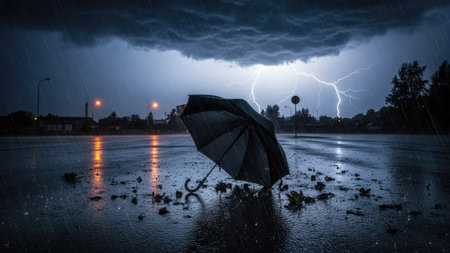 An umbrella lies open in the rain as a powerful thunderstorm rages overhead. Lightning illuminates the dark, wet asphalt, reflecting the streetlights and creating a dramatic atmosphere. The scene suggests an outdoor environment during a storm. This image could be used for editorial purposes or to illustrate weather-related concepts.